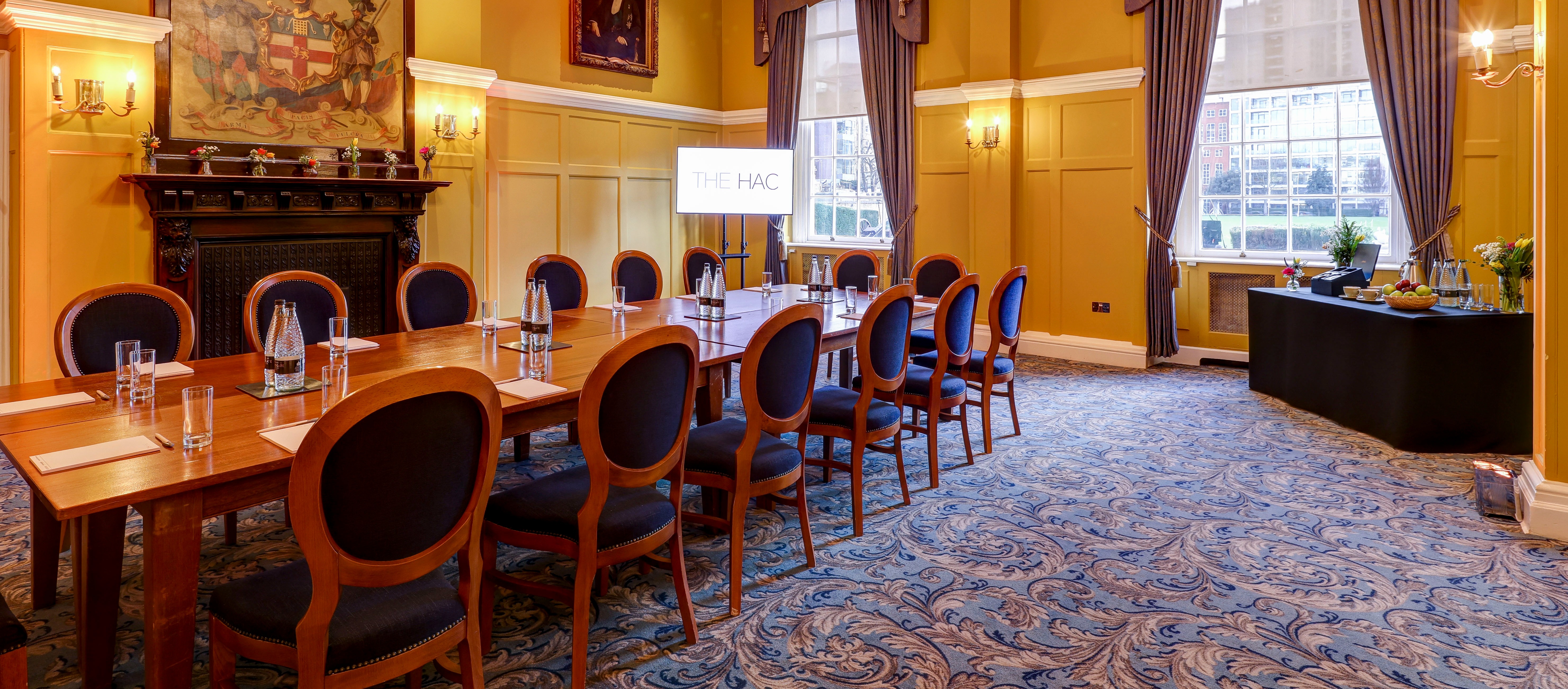The striking blue and yellow colour scheme creates a fabulous energy in the Queen’s Room. Around the space hangs a series of impressive portraits including one of a young Queen Elizabeth II and the huge windows, which overlook Artillery Garden, fill the room with daylight.